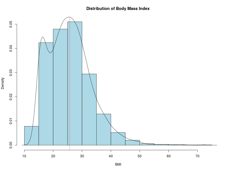 abline(v = mean(DS0012$BMI), lty = "dashed", col = "red")I have thrown in a few bells and whistles here: a kernel density estimate of the underlying distribution and a vertical dashed line at the mean value of BMI.