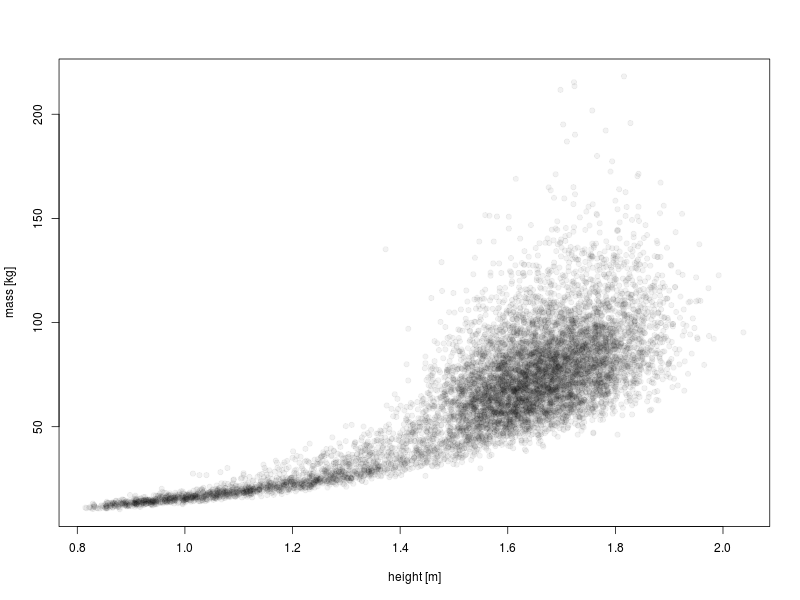 plot(DS0012$height, DS0012$mass, ylab = "mass [kg]", xlab = "height [m]")This clearly shows the relationship between these two variables, however, there is a high degree of overplotting.
