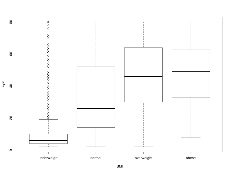 plot(DS0012$BMI.category, DS0012$age, xlab = "BMI", ylab = "age")This produces a boxplot or box-and-whisker plot. For each BMI category there is a box which extends from the first to the third quartile. The dark line within the box is the median. The whiskers extend 1.5 times the interquartile range (IQR) below and above the first and third quartiles. Points lying outside the whiskers can be thought of as outliers. What we can see from this plot is that the median age increases as one moves from the normal to the overweight and finally to the obese categories. Whereas the centre of the age distribution for people with normal BMI is centred in the twenties, it shifts to the forties for the overweight and obese categories.