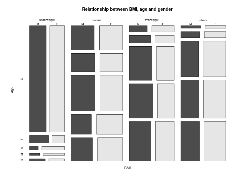 mosaicplot(bmi.age.gender, main = "Relationship between BMI, age and gender",
