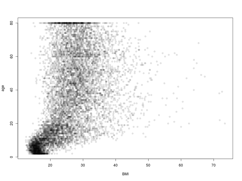 col = rgb(0, 0, 0, 0.1))This produces a scatter plot.