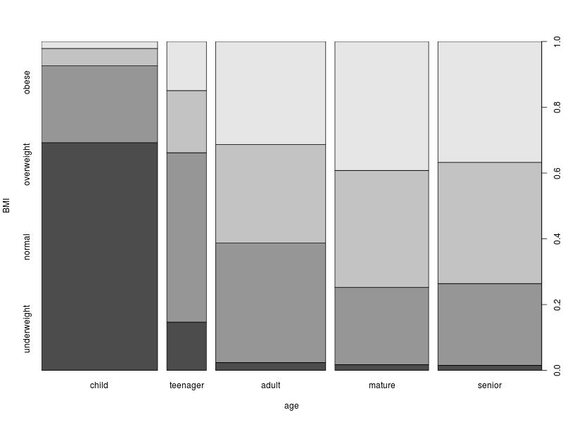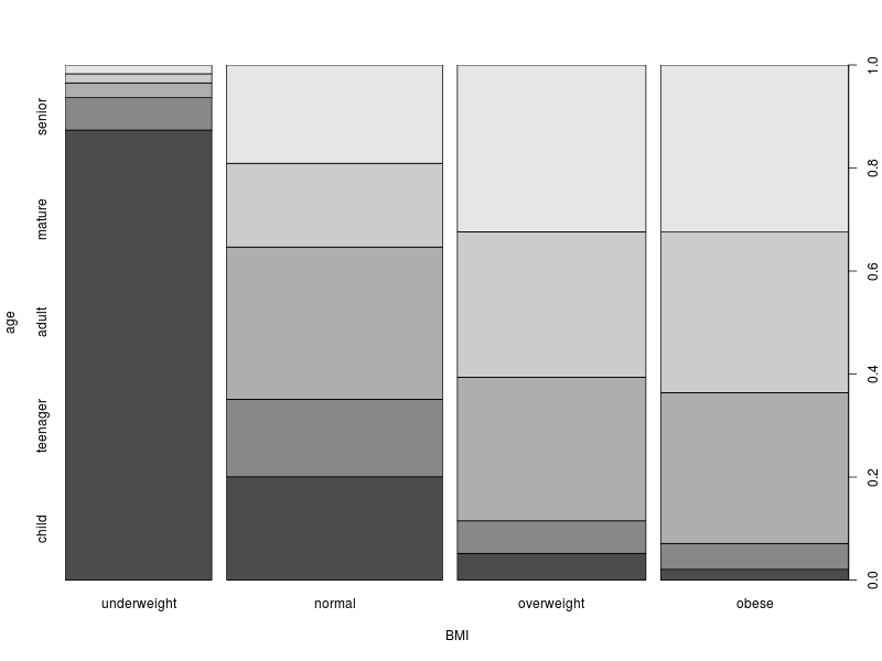 plot(DS0012$age.category, DS0012$BMI.category, ylab = "BMI", xlab = "age")This produces a spineplot. The first thing to note is that the widths of the columns is proportional to the number of samples in each of the corresponding age categories. For example, the number of teenagers is less than half the number of adults.