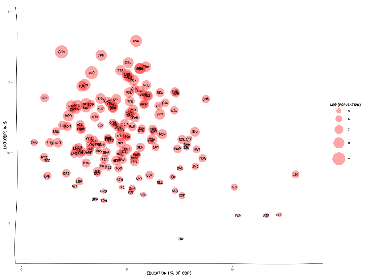 Then came the fun bit: putting the plot together. An introduction to the xkcd package by Emilio Torres-Manzanera got me up to speed. And here is the result. Click on the image below to see it at higher resolution. Interesting that small countries like our neighbour, Lesotho, are spending a large fraction of their GDP on education. Also I must confess to having been previously completely unaware of the existence of Tuvalu (TUV), which is the fourth smallest country in the world (and the smallest country in my data).