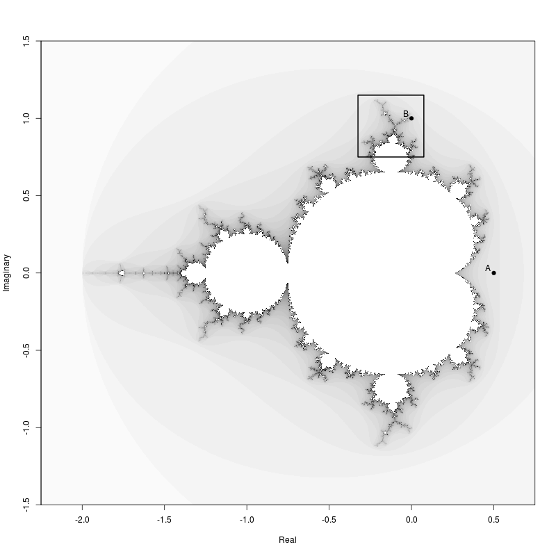 image(x, y, zoom.mandelbrot, col = rev(gray.colors), useRaster = TRUE, xlab = "Real",
