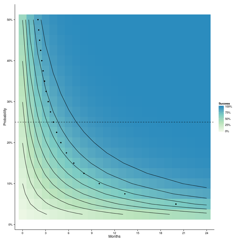 As before, months are plotted along the x-axis. Now, however, the y-axis reflects the probability of conception in any one month. The value of 25% that we have been using is indicated by the horizontal dashed line. The colour scale then shows the cumulative probability. Contours are superimposed at intervals of 10% extending from 10% up to 90%.