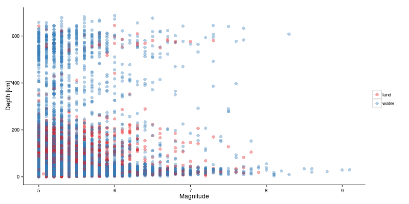 Do the magnitude and depth of earthquakes on land differ significantly from those which occur under water? Looking at the plots below suggests that there is no qualitative difference.
