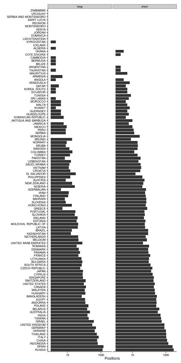As before, making sense of this is aided by a visualisation. Below is a plot showing the number of long and short positions on EURUSD for a range of countries. We can see that overall the most trades have originated in Spain and Russia and that the majority of these positions are shorts.