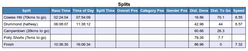 He was not recorded by either of the timing mats at Camperdown or Polly Shortts. It is well known that these mats are not perfect and sometimes they do miss runners. However, the missing splits at these mats plus the extraordinary time for the second half of the race are rather condemning.