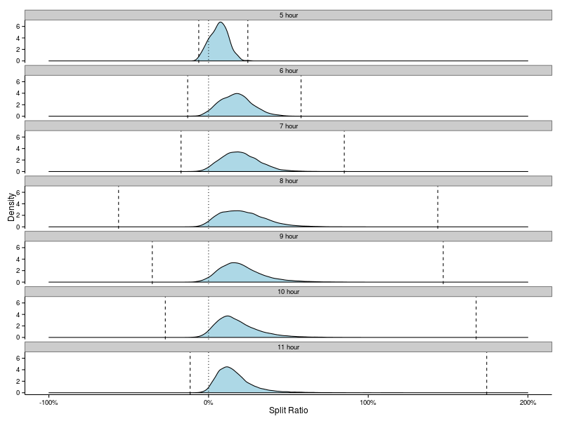 We can see that only a very small fraction of the field achieves a negative split. And that these runners generally only shave a few percent off their first half times. The dashed lines on the plot indicate the extreme values of the split ratio. Both of these are a long way from the body of the distribution. In statistical terms, either of these extremes is highly improbable.