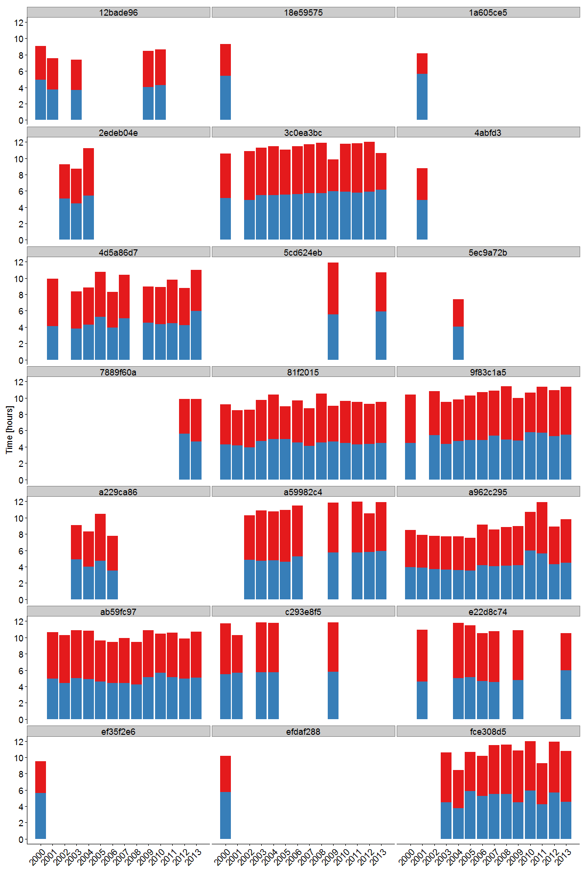 For a number of these runners there are only splits data for a few years, so it’s quite difficult to say anything conclusive. The negative split achieved by 1a605ce5 in 2001 looks pretty extreme though… Others runners, like 4d5a86d7, 9f83c1a5 and fce308d5 have a high degree of variability in both their first and second half times, so again it is difficult to spot an anomaly with certainty.