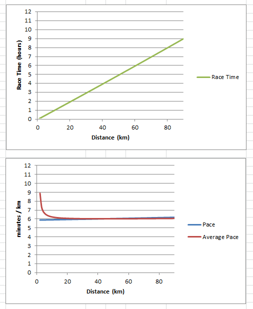 The spreadsheet uses a simple linear model which assumes that your pace will gradually decline at the rate you have specified. If you give 0% for your slowing down percentage then the calculations are performed on the basis of a uniform pace throughout the race. Of course, neither the linear model nor a uniform pace are truly realistic. We all know that our pace will vary continuously throughout the race as a function of congestion, topography, hydration, fatigue, motivation and all of the other factors which come into play. However, as noted by the eminent statistician George Box “all models are wrong, but some are useful”. In this case the linear model is a useful way to account for the effects of fatigue.