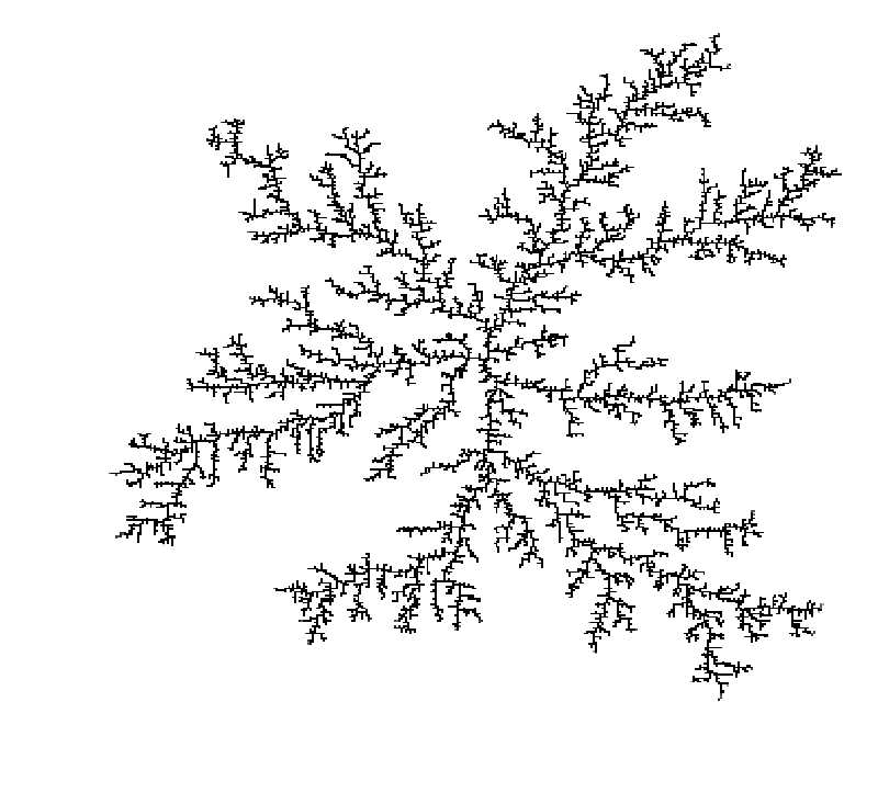 This is nowhere near being an efficient implementation of DLA. But it gets the job done and is illustrative of how the algorithm works. To do production runs one would want to code the algorithm in a low-level language like C or C++ and take advantage of the inherent parallelism of the algorithm.