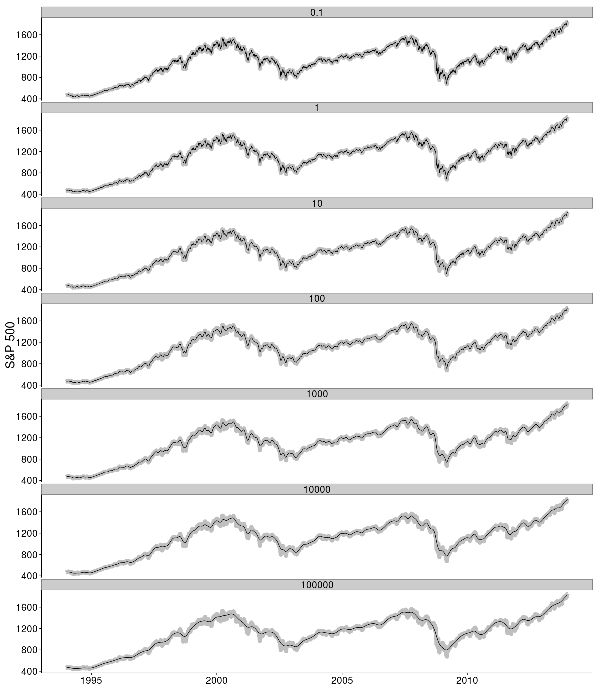 SP500 = SP500[, c(1, 5)]Then systematically apply the filter with a range of regularisation parameters scaling from 0.1 to 100000 in multiples of 10. The results are plotted below. In each panel the grey data reflect the raw daily values for the S&P500 index. Superimposed on top of these are the results of filtering the signal using the specified regularisation parameter. As anticipated, larger values of \(\) result in a smoother curve since the filter is more heavily penalised for curvature in the filtered signal.