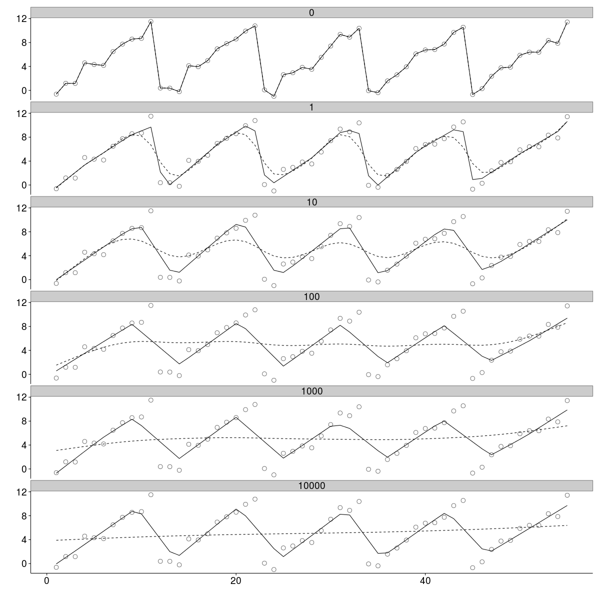 y <- y + rnorm(length(y))We systematically apply the L1 filter with a range of regularisation parameters extending from 1 to 10000 in multiples of 10.