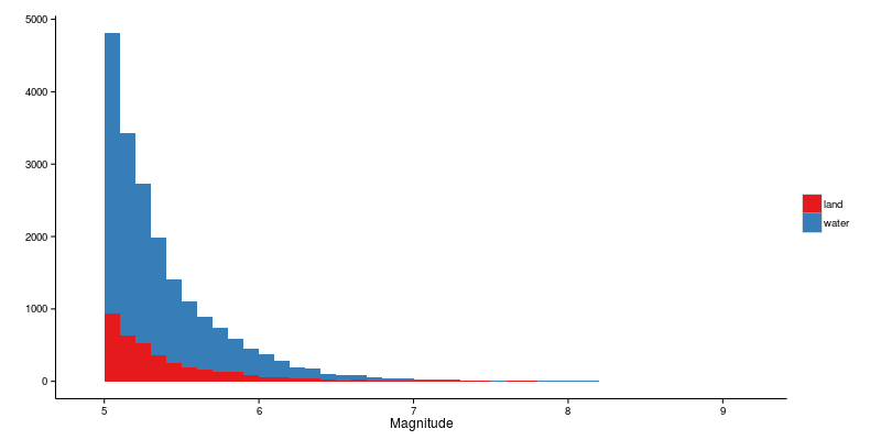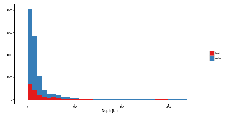 Do the magnitude and depth of earthquakes on land differ significantly from those which occur under water? Looking at the plots below suggests that there is no qualitative difference.