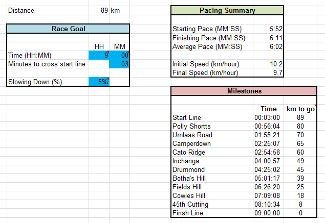 Although I have been thinking vaguely about my Plan A goal of a Bill Rowan medal at the Comrades Marathon this year, I have not really put a rigorous pacing plan in place. I know from previous experience that I am likely to be quite a bit slower towards the end of the race. I also know that I am going to lose a few minutes at the start. How fast does this mean I need to run in order to get from Pietermaritzburg to Durban in under 9 hours?