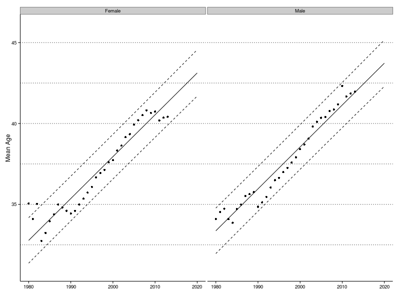 Maybe clumping the data together into decades is hiding some of the details. The plot below shows the average age for each gender as a function of the race year. The plotted points are the observed average age, the solid line is a linear model fitted to these data and the dashed lines delineate a 95% confidence interval.