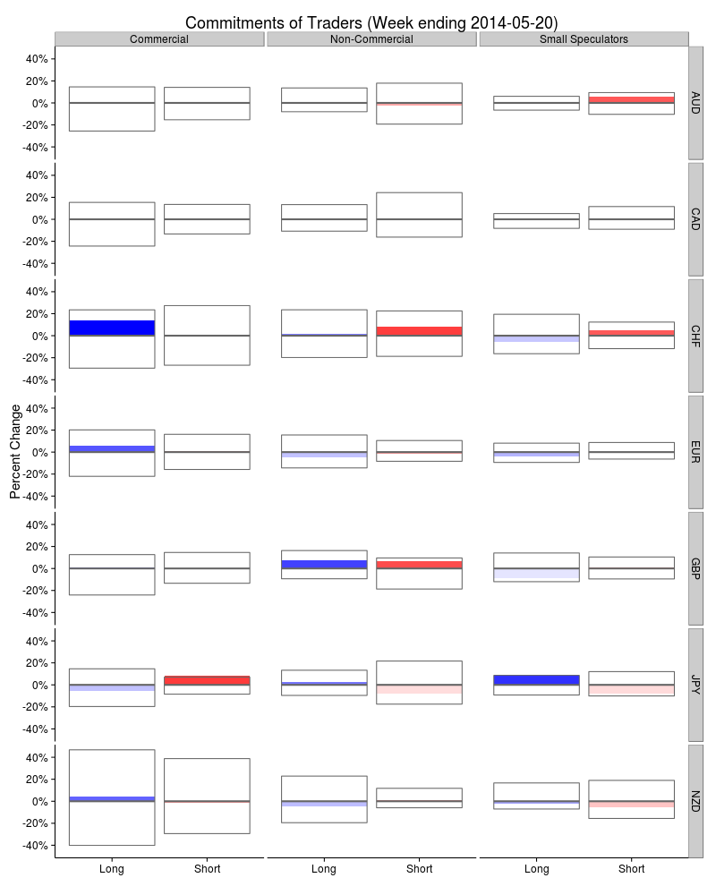 A synopsis of these data for a range of currencies is given in the plot below. This is how the plot works. Again we will consider Commercial trades involving the JPY. We are thus looking at the second to last row and first column. Here there are two cells: long trades on the left and short trades on the right. The coloured bars indicate the relative change for long (blue) and short (orange) trades. The relative changes are normalised to the total number of trades for the currency and sector in the previous week. We can see here that the orange bar is broader than the blue bar indicating that the change in short trades is larger than the change in long trades. The grey boxes show the 95% confidence interval for the expected range of these changes. The closer the bars come to the edge of the boxes, the more significant the change. In this case, the change in the number of short trades is significant and is probably an indication of a change in sentiment regarding the JPY.