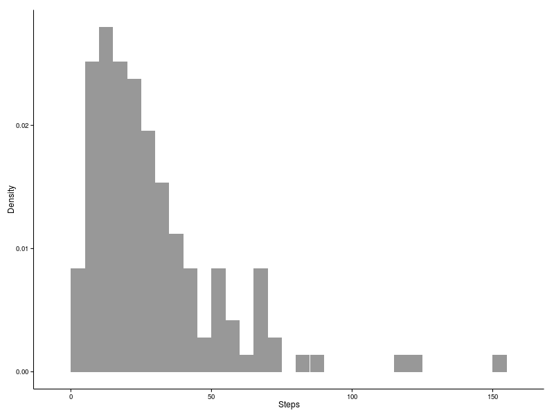 Taking a look at the distribution of diffusion times below we can see that there is a strong peak between 10 and 15. The majority of particles diffuse in less than 40 steps, while the longest diffusion time is 151 steps. The grid above shows that, as one would expect, smaller diffusion times are found close to the surface of the cluster, while longer times are embedded closer to the core.