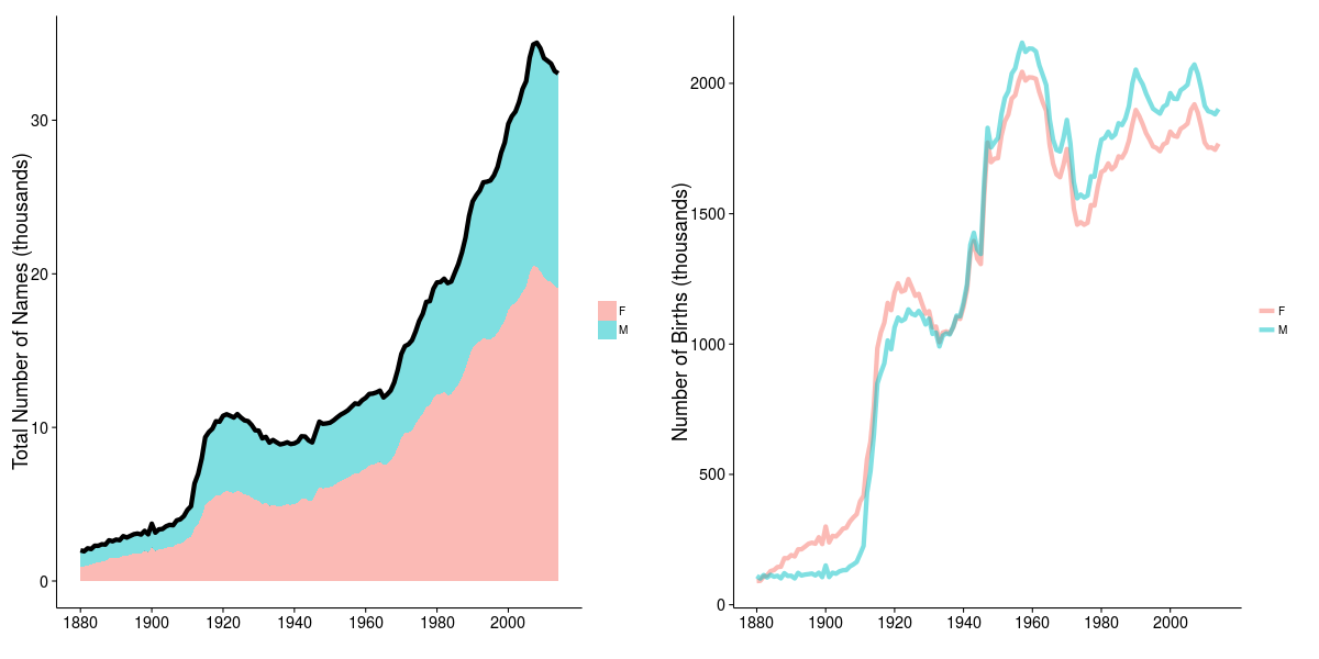If one compares the number of names (left panel) to the number of births (right panel), then something interesting emerges: the explosion of names around World War I is mirrored by a sudden increase in the number of births. However, the next peak in births, following the end of World War II, was not accompanied by a significant increase in the variety of names. Possibly these “Baby Boomers” were more or less satisfied with the range of names already in use.