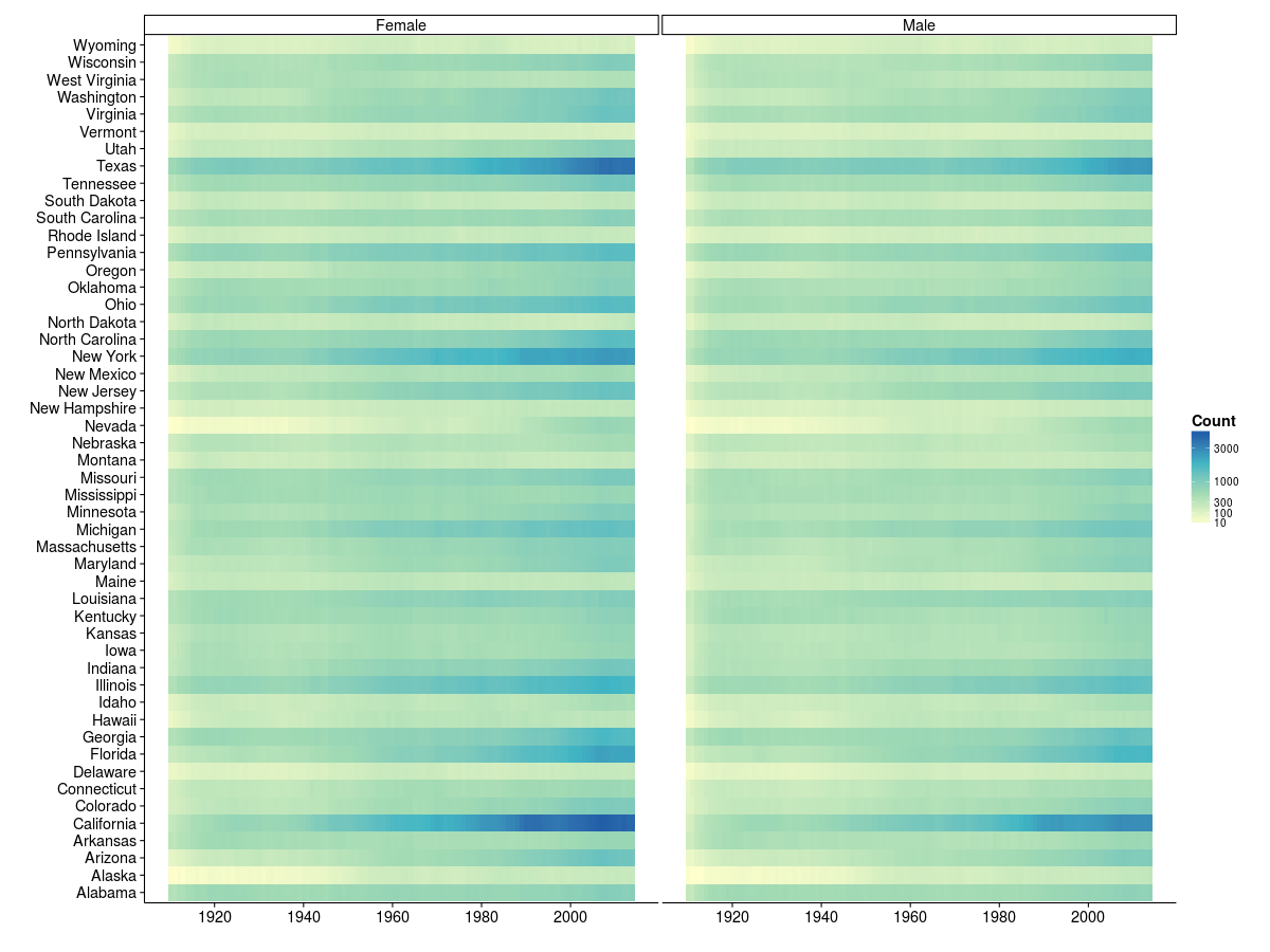Is it reasonable to assume that these patterns apply uniformly across the entire United States? Let’s have a look. If we break the number of names in use down according to state then the data look like this: