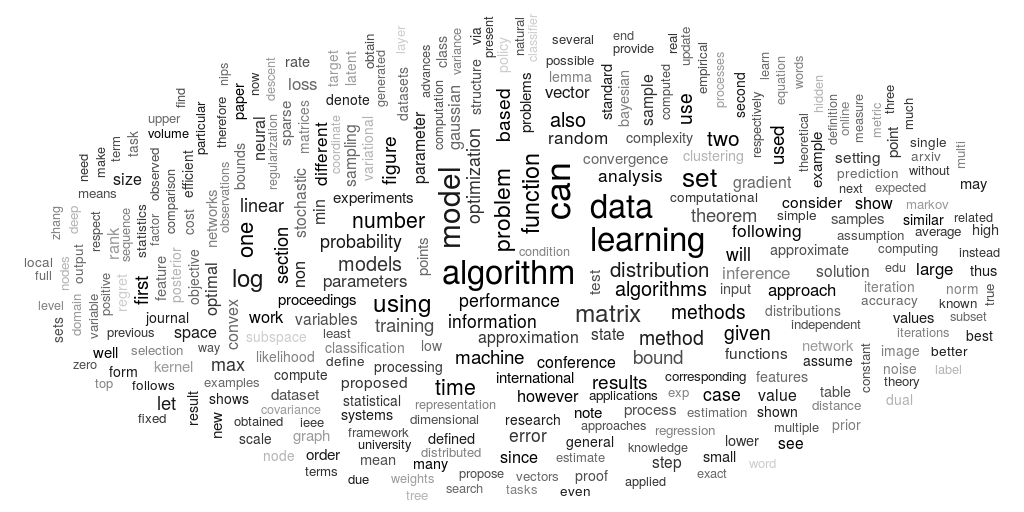 Constructing a word cloud from papers submitted to the ICML conference. Text was extracted from PDF papers using the Poppler library.