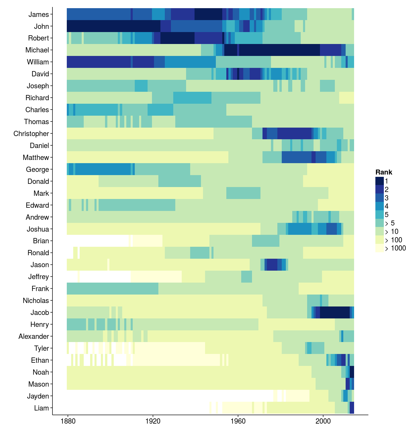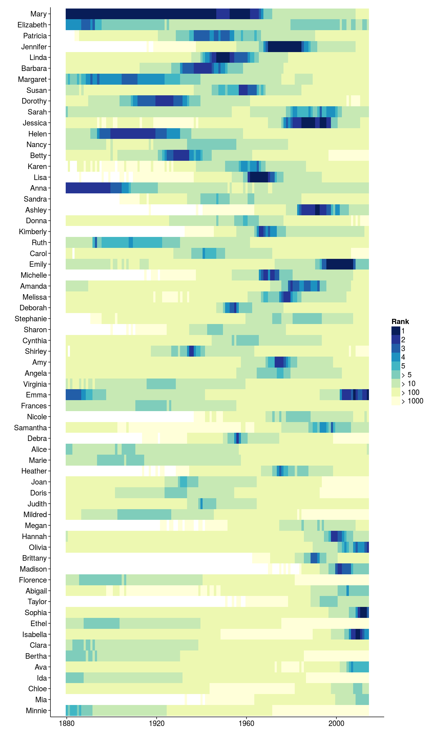 Popularity of various first names over time, showing how some names are briefly (and wildly!) popular, while others are perennial favourites.