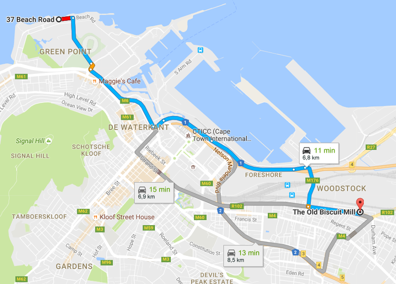 Route for a trip from Mouille Point to the Old Biscuit Mill.