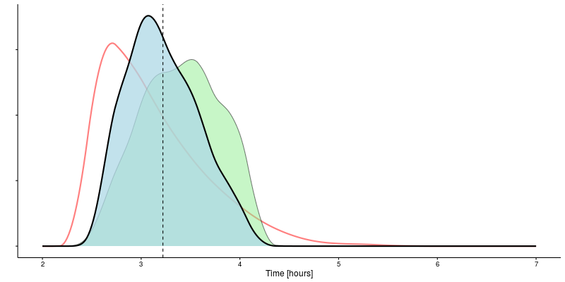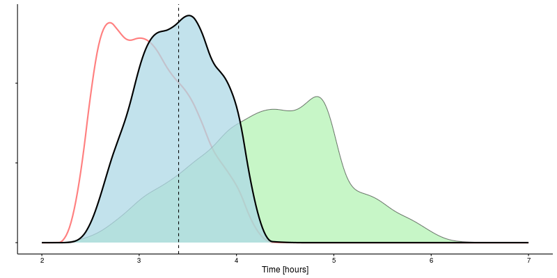 Having incorporated the 10 km finishing time, the expected marathon time drops to 03:24. Quite an improvement! The 95% confidence interval also narrows to between 02:38 and 04:07.