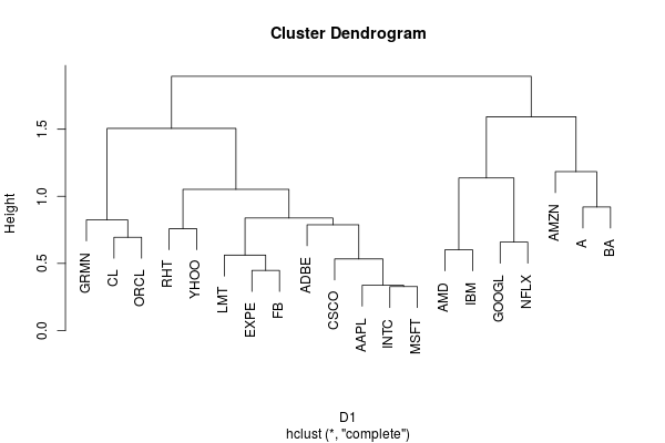 C1 <- hclust(D1)Looking at the dendrogram below, it appears that a cut at a height of around 1.25 would divide the stocks into four groups. Not too surprisingly, INTC, LMT and MSFT end up in the same group along with CSCO, EXPE and FB.