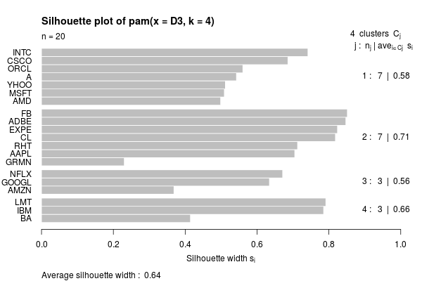 Since the dissimilarity matrix is similar to one we’ve already looked at, we’ll try a different approach to clustering, using the Partitioning Around Medoids (PAM) algorithm. Looking at the associated silhouette plot we can see that the high level structure is similar: AMZN, GOOGL and NFLX are clustered in one branch, while LMT, IBM and BA are in another.