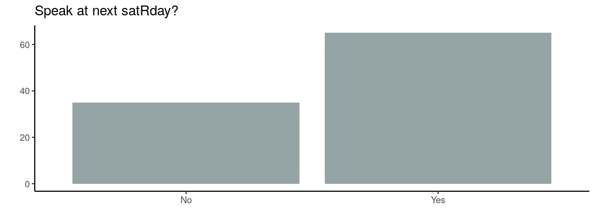 People enjoyed satRday, but would they be keen to speak next year? Just slightly less than two thirds of people were inspired to tell us about their experience with R next year. We are expecting to receive a bundle of talk submissions!