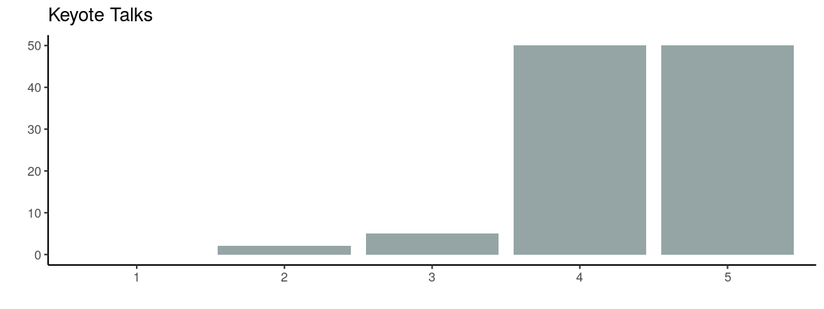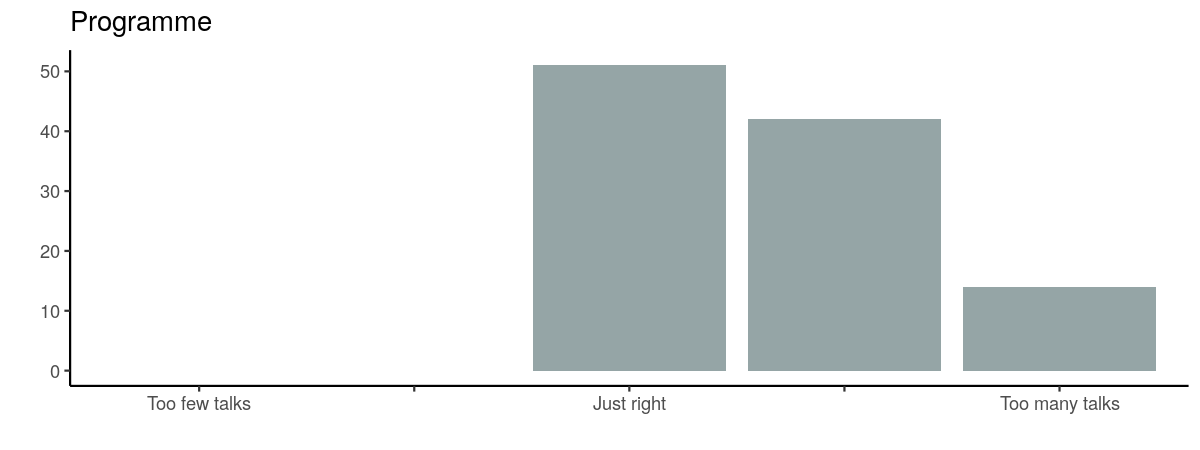 It looks like we hit the sweet spot with three keynote speakers. We might drop this to two next year though to leave more space in the programme for local speakers. We’ve already secured two phenomenal keynotes for next year: Maëlle Salmon and Stephanie Kovalchik.