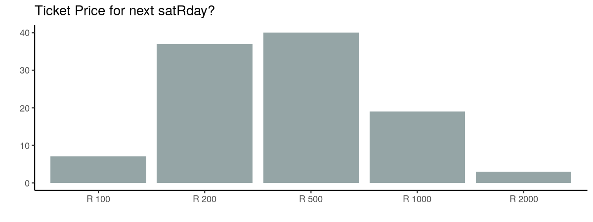 What did people think would be an appropriate price for tickets to another satRday? It seems that the majority thought that either R 200 or R 500 would be appropriate. Around 20% of the respondents would pay R 1000 or more.