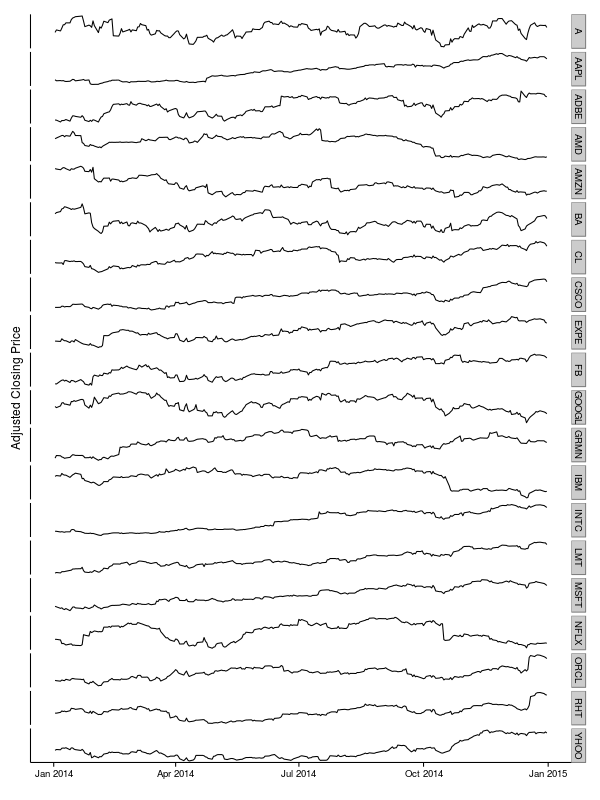 stocks = t(as.matrix(stocks))Just to get an idea of what these data look like, we can put together a compound time series plot.