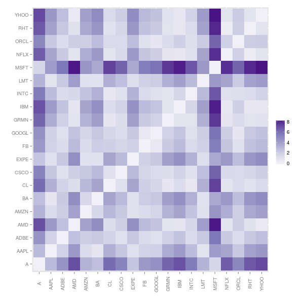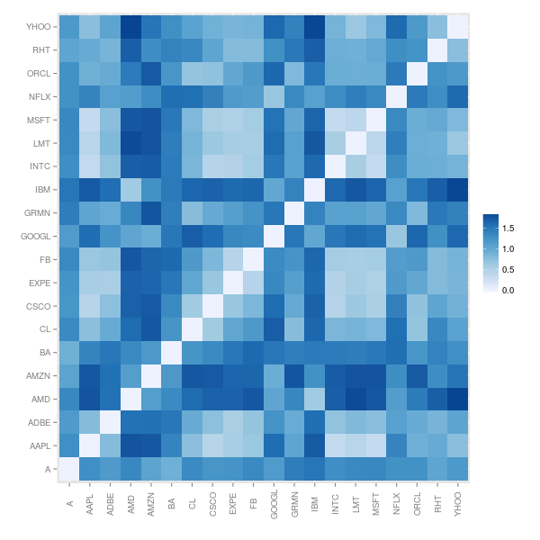 Note that, since this is a measure of dissimilarity, the range of correlation has been shifted from [-1,1] to [0,2]. To get an idea of what the dissimilarity data look like, we’ll look at a mosaic plot. There appear to be blocks of similar stocks. For example, INTC, LMT and MSFT are not too dissimilar to each other. They are also not dissimilar to CSCO, EXPE or FB. But they are very different to AMD and AMZN.
