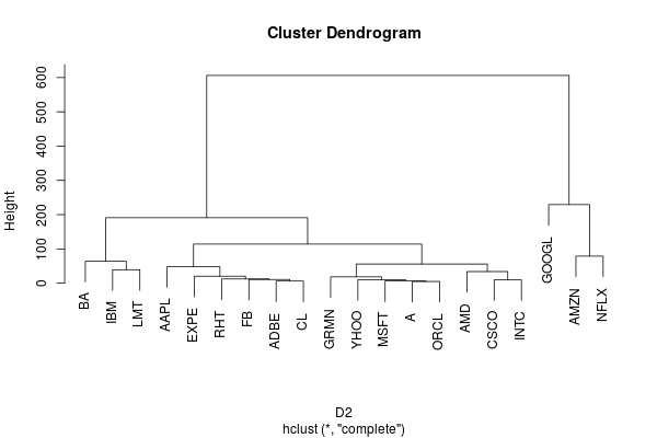 C1 <- hclust(D1)Looking at the dendrogram below, it appears that a cut at a height of around 1.25 would divide the stocks into four groups. Not too surprisingly, INTC, LMT and MSFT end up in the same group along with CSCO, EXPE and FB.
