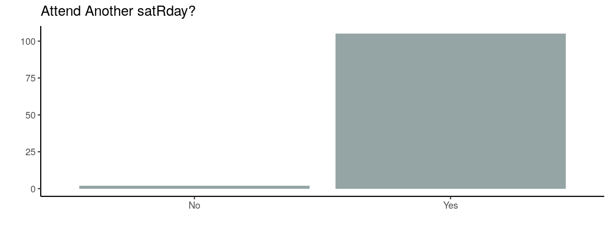 People enjoyed satRday, but would they be keen to speak next year? Just slightly less than two thirds of people were inspired to tell us about their experience with R next year. We are expecting to receive a bundle of talk submissions!