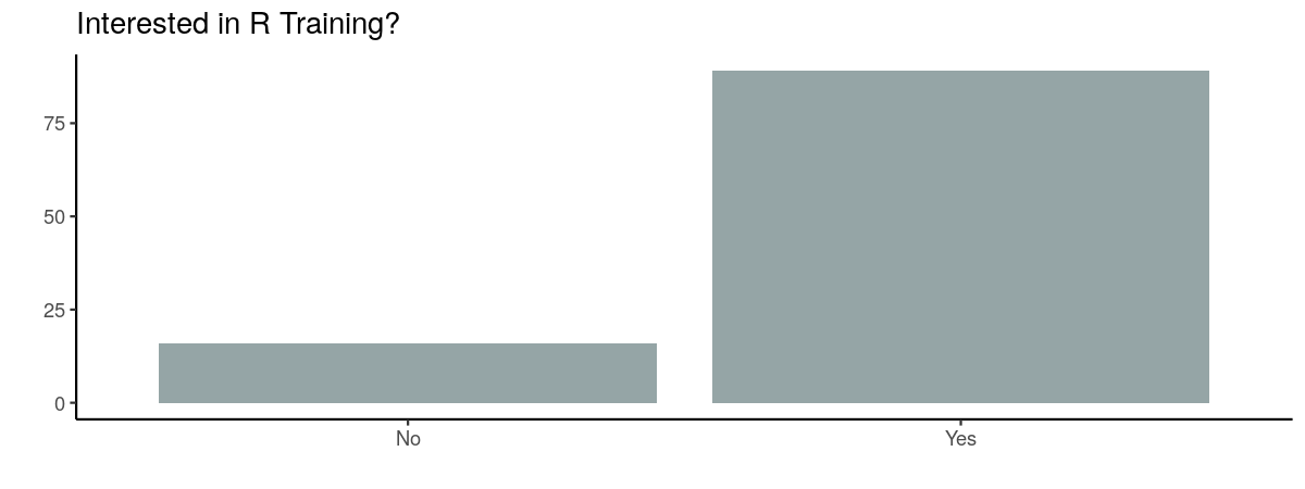 Around 85% of the attendees were keen to engage in R training, so there’s certainly a gap to be filled.