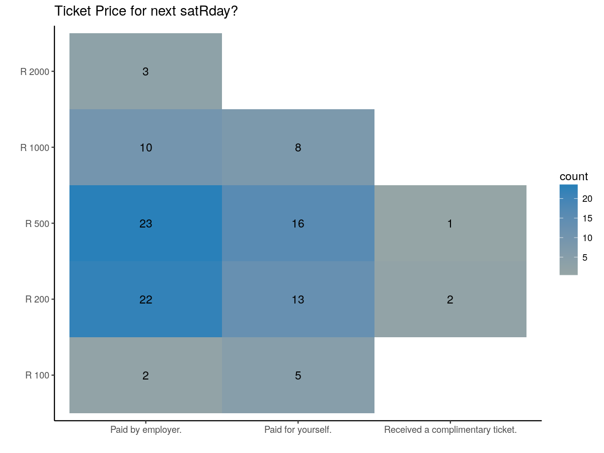 What did people think would be an appropriate price for tickets to another satRday? It seems that the majority thought that either R 200 or R 500 would be appropriate. Around 20% of the respondents would pay R 1000 or more.