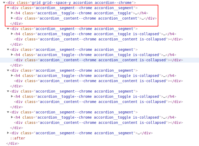 Bringing JavaScript into the mix can make things appreciably more complicated: when the content of a panel is not visible, it’s probably not even present in the page source. This, of course, means that it’s inaccessible to a scraper (if it’s not in the page then you cannot scrape it!). You can see this effect clearly in the HTML code (below). The active panel (framed in red) has content in the inner div. The inactive panels all have class is-collapsed and for each of them the inner div is empty.