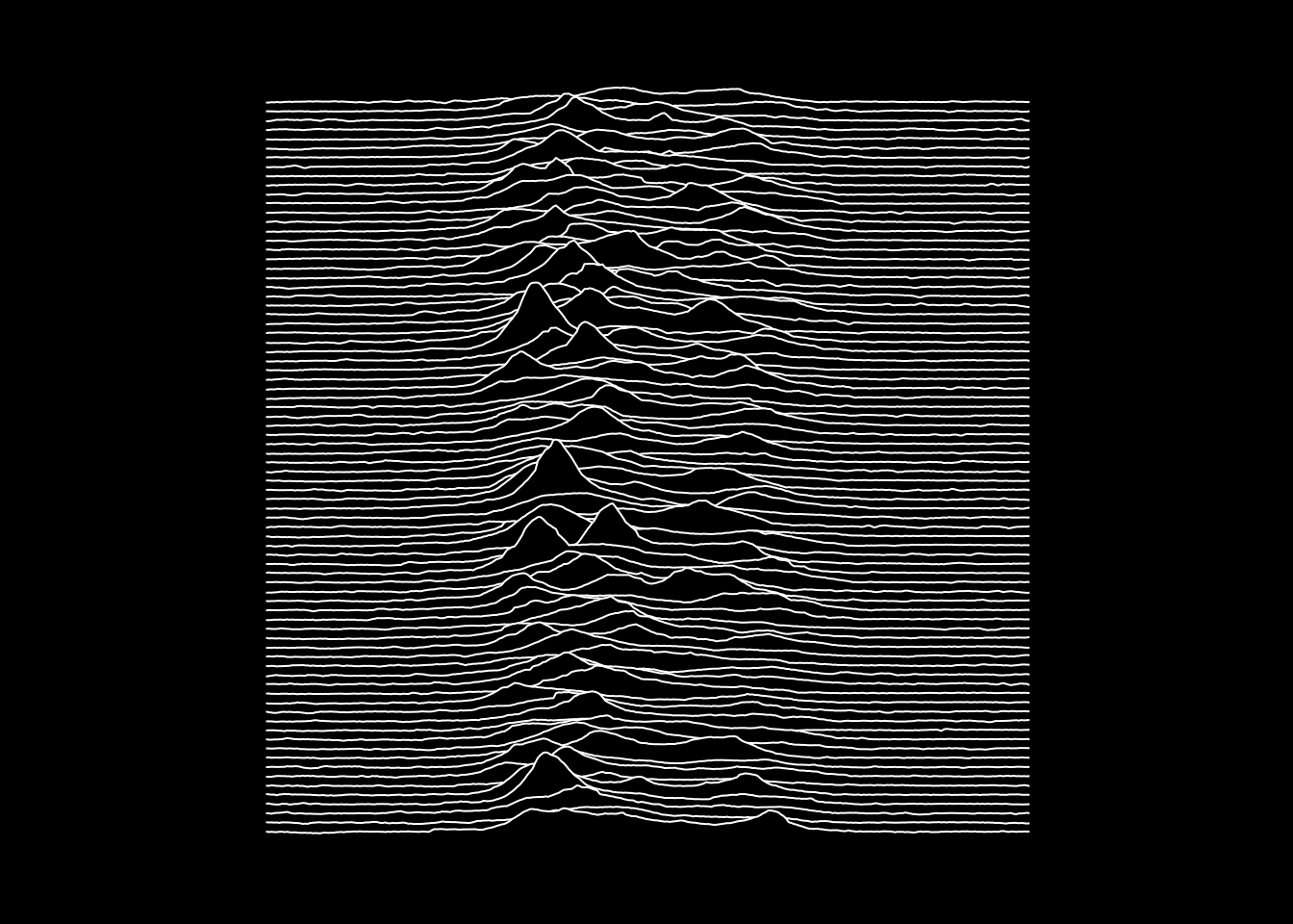 For some time I’ve wanted to recreate the cover art from Joy Division’s Unknown Pleasures album. The visualisation depicts successive pulses from the pulsar PSR B1919+21, discovered by Jocelyn Bell in 1967.