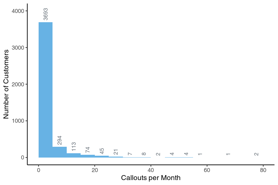 The plot below is a histogram showing the distribution of customers broken down by the number of callouts in a single month. It’s apparent that the vast majority of customers only generate a few callouts (the first bar). These do not place a burden on the response fleet. They are the good customers. But there’s a long tail of callout counts, with some customers generating tens of callouts. They are the bad customers: they place disproportionate demands on the response fleet. Many of these callouts are false alarms, possibly due to customer negligence or faulty equipment.