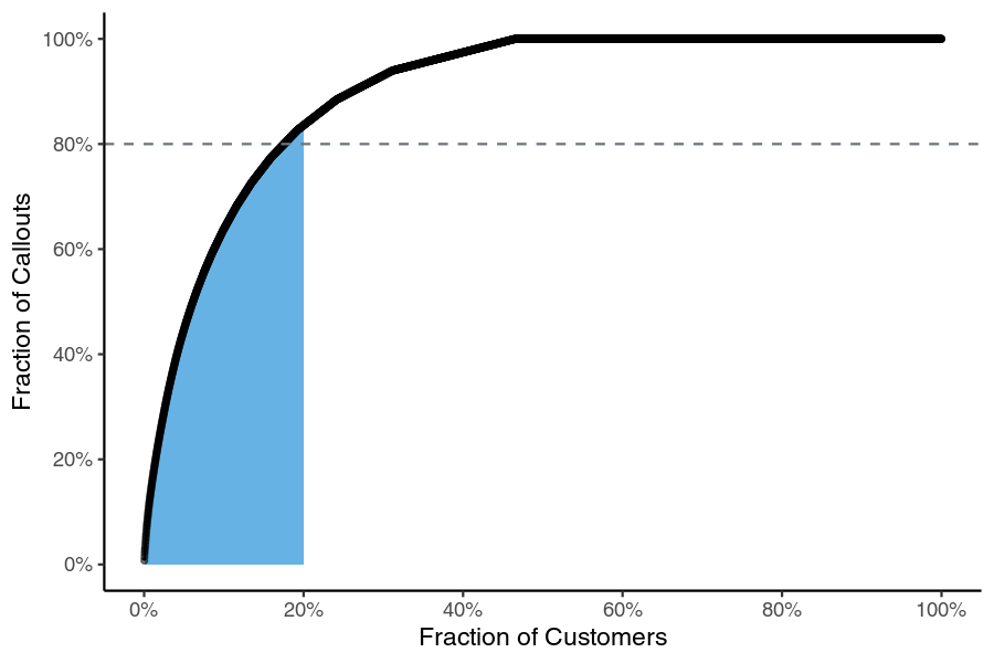 It’s evident that the Pareto Principle does indeed apply: the shaded area covers the top 20% of customers, who accoun—t for almost precisely 80% of the callouts.
