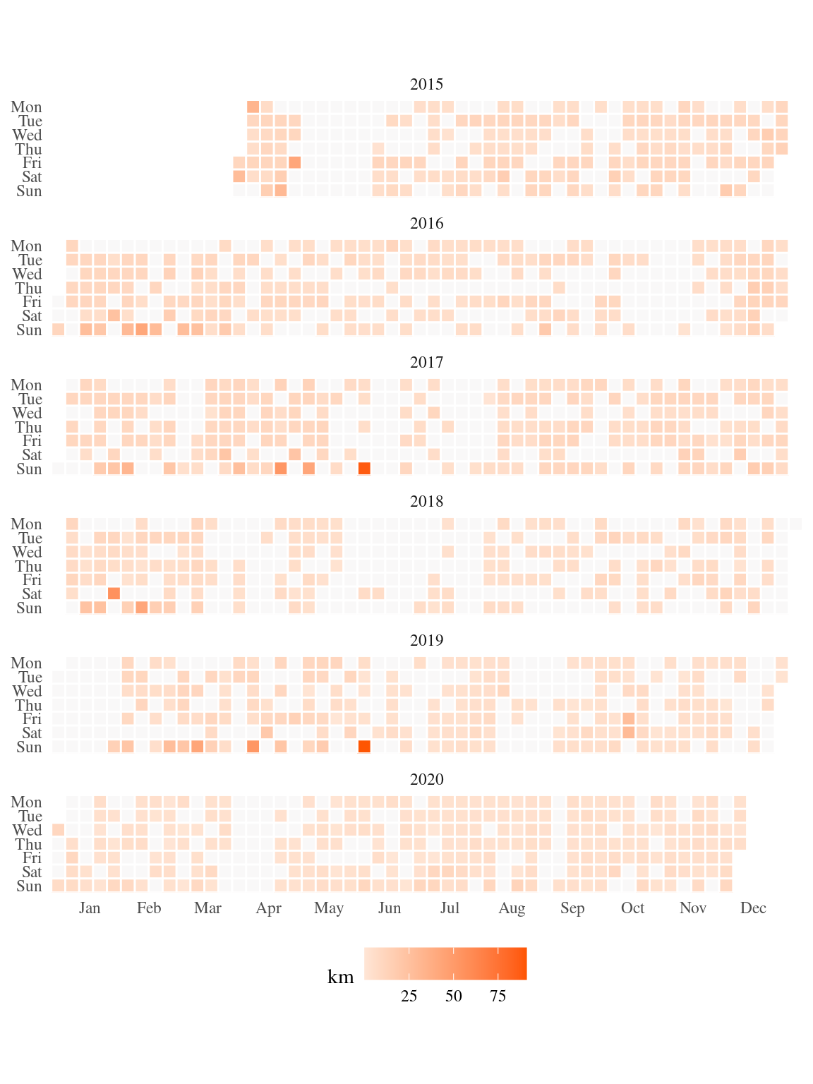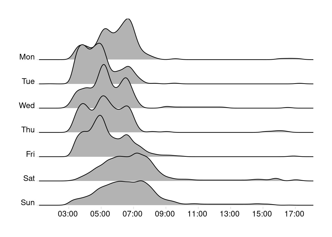 Times on week days are bimodal, probably because of a shift in behaviour since I have started working mostly from home (runs are now later because I don’t need to rush off to work).