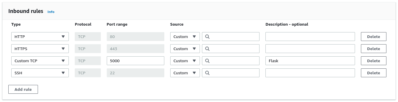 This security group, which allows inbound access on port 5000, is defined using the Custom TCP type and the Anywhere source.