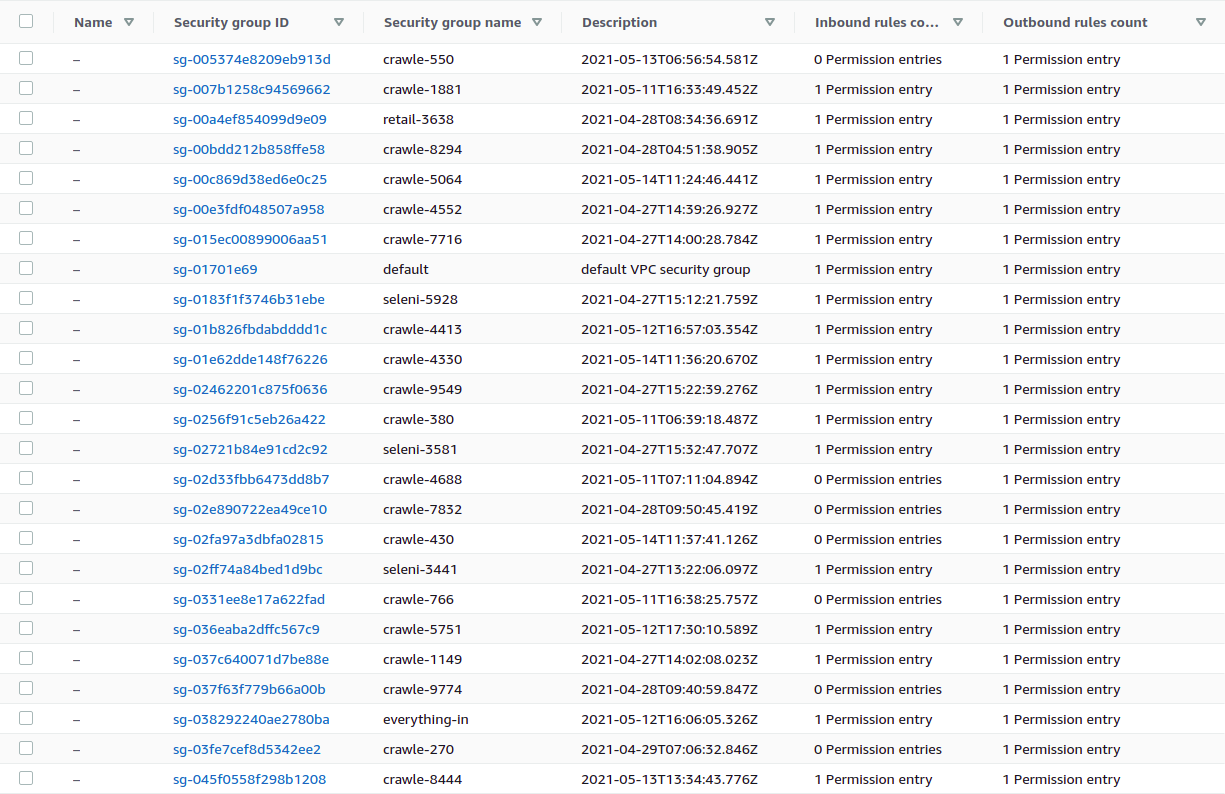 AWS will helpfully create new security groups for you. I used to absently let AWS just create a security group for each new resource. This was a mistake. My account became cluttered with a random assortment of old security groups. There was no system. Complete disorder.
