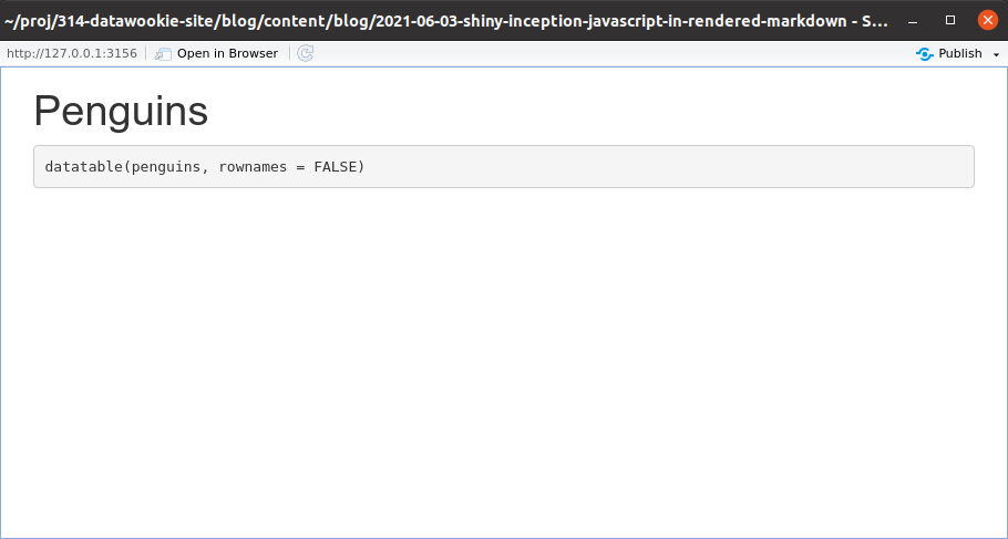 I’m busy helping a colleague with a Shiny application. The application includes HTML content rendered from a .Rmd document. However, there’s a catch: the .Rmd uses the {DT} package to render a dynamic DataTable. It turns out that this doesn’t immediately work because the JavaScript in the embedded document isn’t run.