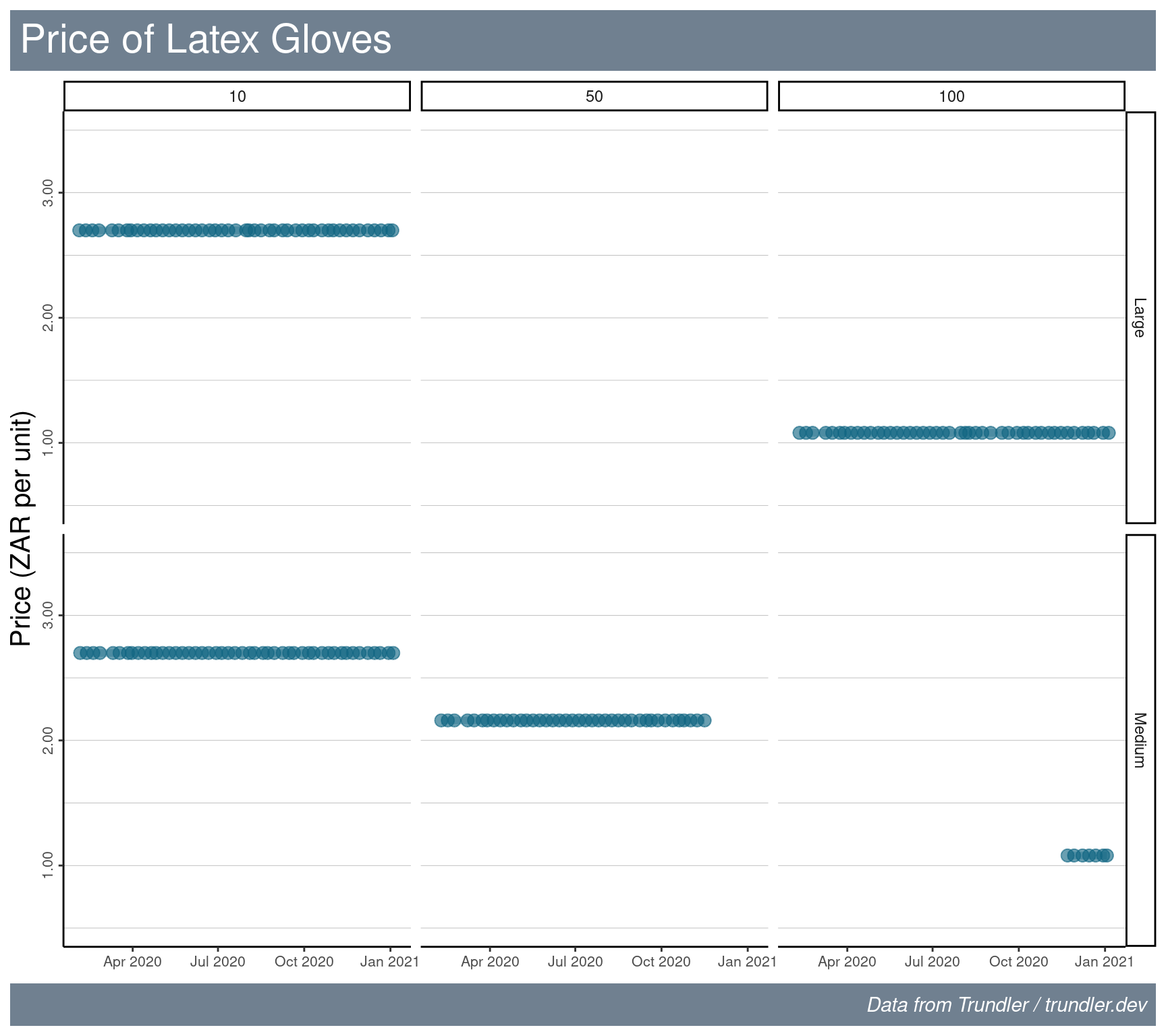 Interestingly the price of these gloves has remained completely static over the period of this analysis. Furthermore, as one would expect the price per unit gets lower for larger pack sizes.