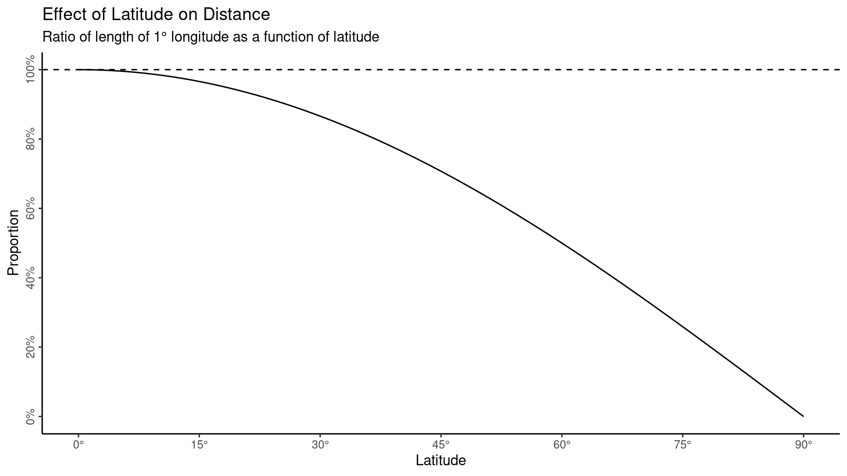 Why is this important? Well, it means that 1° by 1° maps at the equator and at 60° latitude will represent very different areas and have different aspect ratios. 💡 For presentation purposes, this effect can be mitigated by choosing an appropriate map projection.
